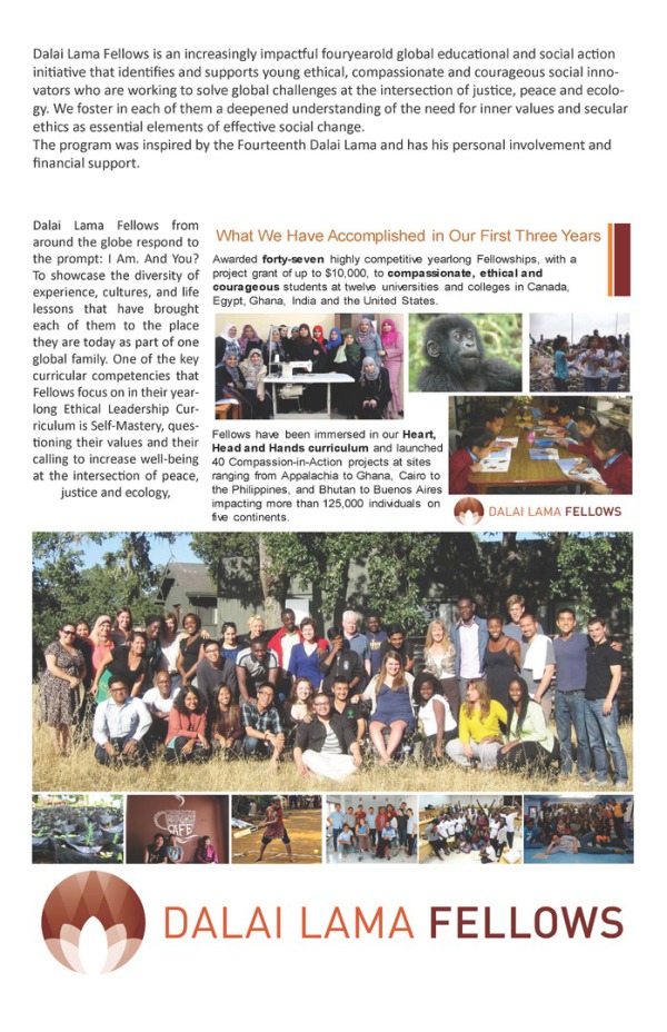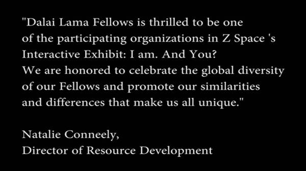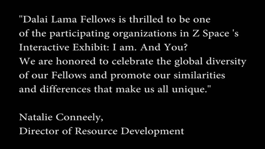 Dalai Lama Fellows est une organisation internationale chargée de former de jeunes acteurs engagés dans le développement social. L'organisation était présente lors de I am. And you? en juillet 2014 à Z Space, San Francisco. Les visiteurs pouvaient découvrir les portraits d'une dizaine de "fellows" à travers le monde, ayant tous répondu à la question évoquée par le titre de l'exposition:
